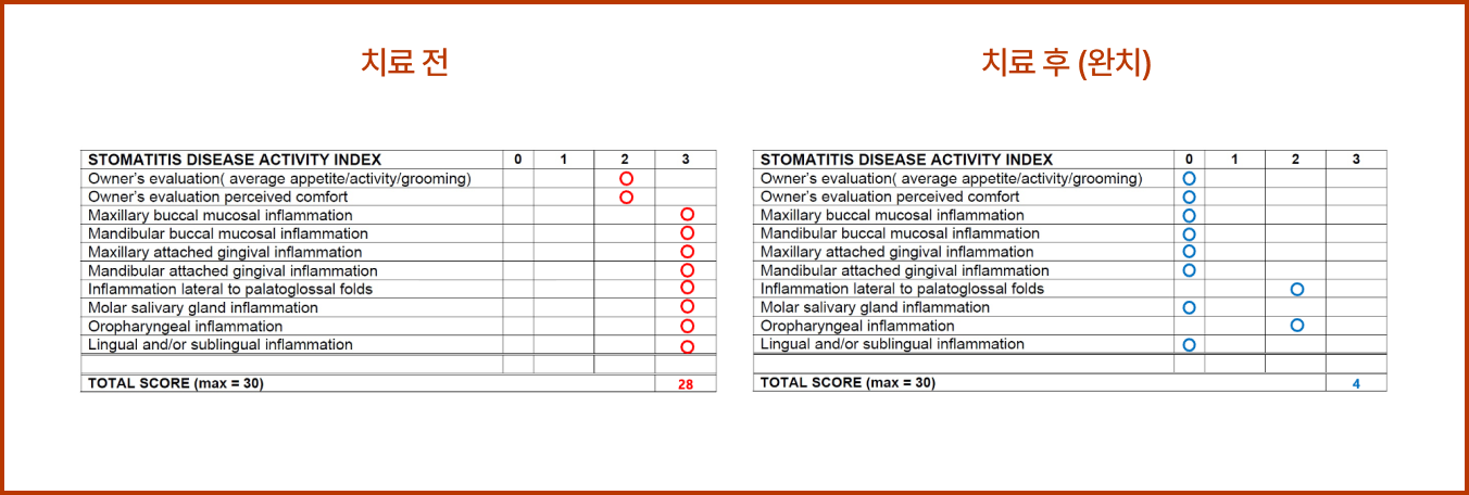 고양이에서 만성구내염은 자가면역 질환의 하나로 입 안 점막과 잇몸 주위에 심각한 염증을 일으킴으로 인해 통증을 유발하고, 만성적인 식욕부진과 체중 감소가 지속됩니다. 전체 치아를 발치해도 30%의 환자들은 치료 반응이 없으며, 지속적인 면역억제제 투여가 당뇨와 같은 대사성 질환을 일으킬 수 있습니다.